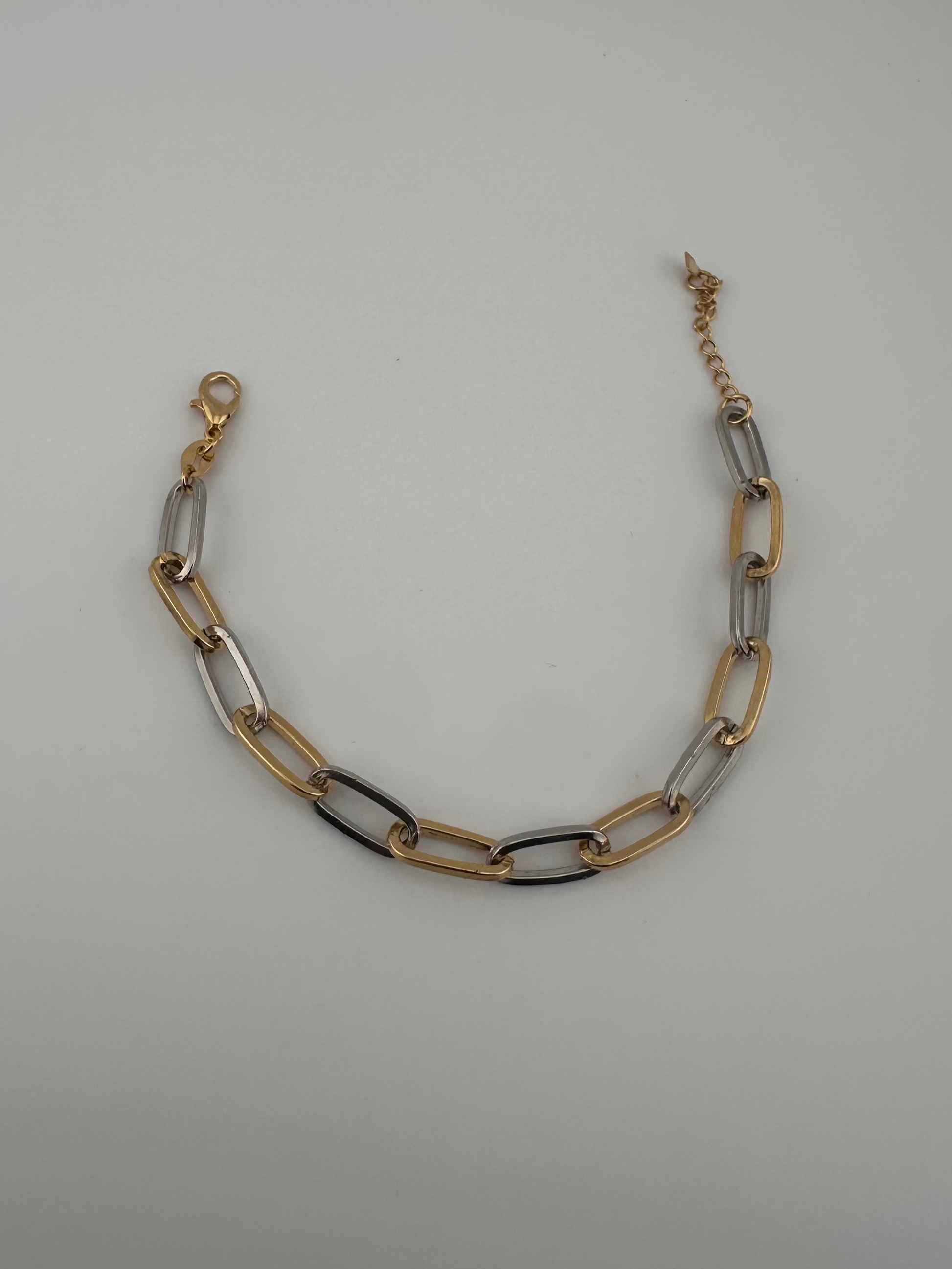 Modern elegance meets everyday versatility in the Dual Glow Paperclip Bracelet. Crafted from 18k gold-filled metal, this striking design features alternating links of classic gold and luminous white gold tones. With its bold paperclip style and contemporary two-tone finish, it’s the perfect piece to elevate your look with effortless sophistication.
