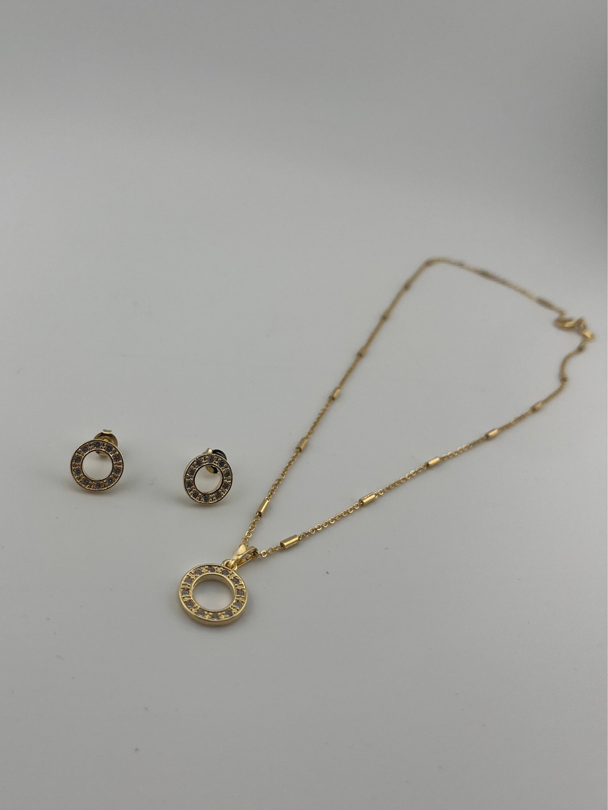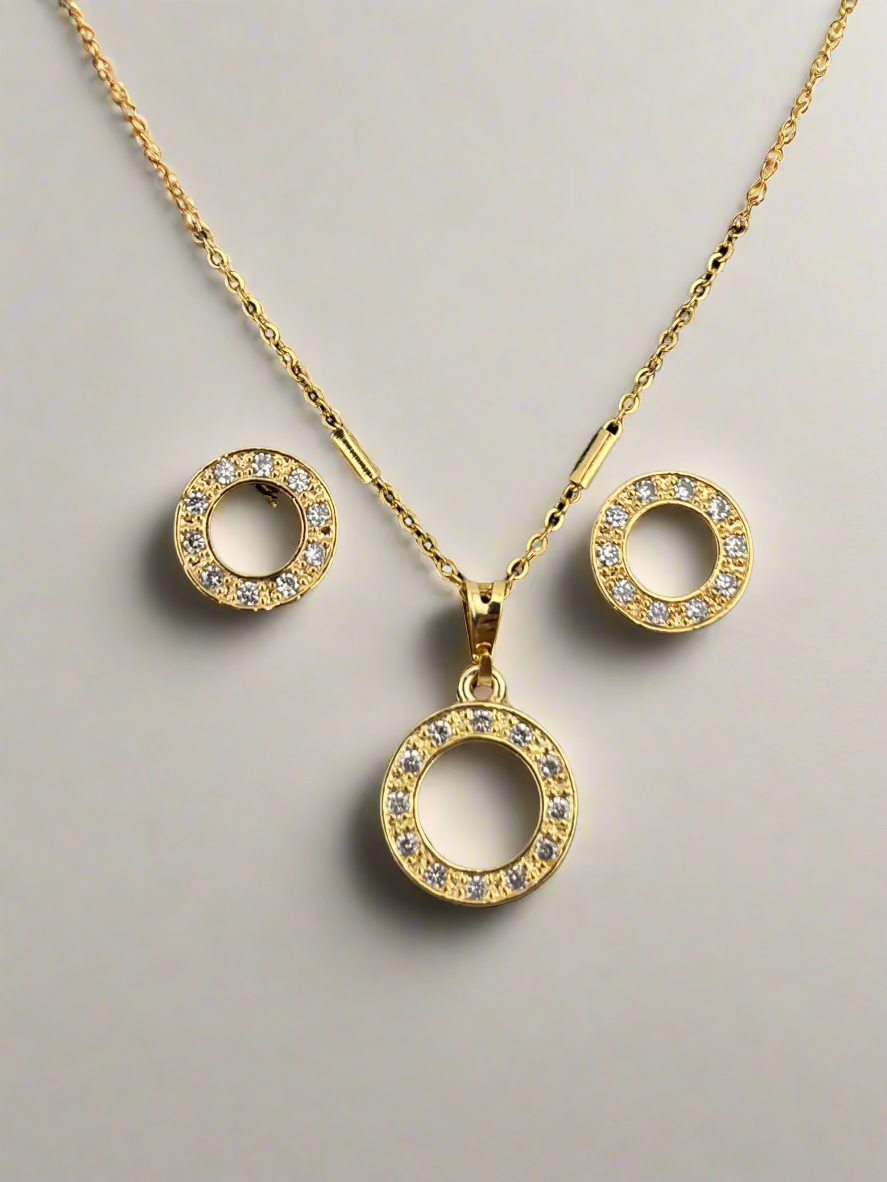 imple yet stunning, the Eternal Spark Set features a perfectly polished circle design adorned with brilliant cubic zirconia, all set in luxurious 18k gold-filled metal. This matching necklace and earrings duo symbolizes wholeness and timeless beauty, offering just the right amount of sparkle for both everyday elegance and special occasions. Hypoallergenic and nickel-free, designed with comfort and shine in mind.