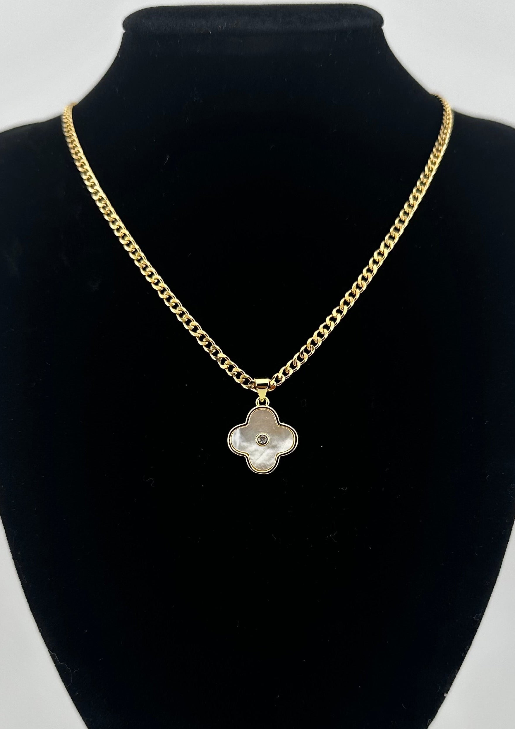 A radiant mother-of-pearl flower pendant that glows with natural iridescence. Delicate, feminine, and timeless—perfect for adding a touch of elegance to any look.