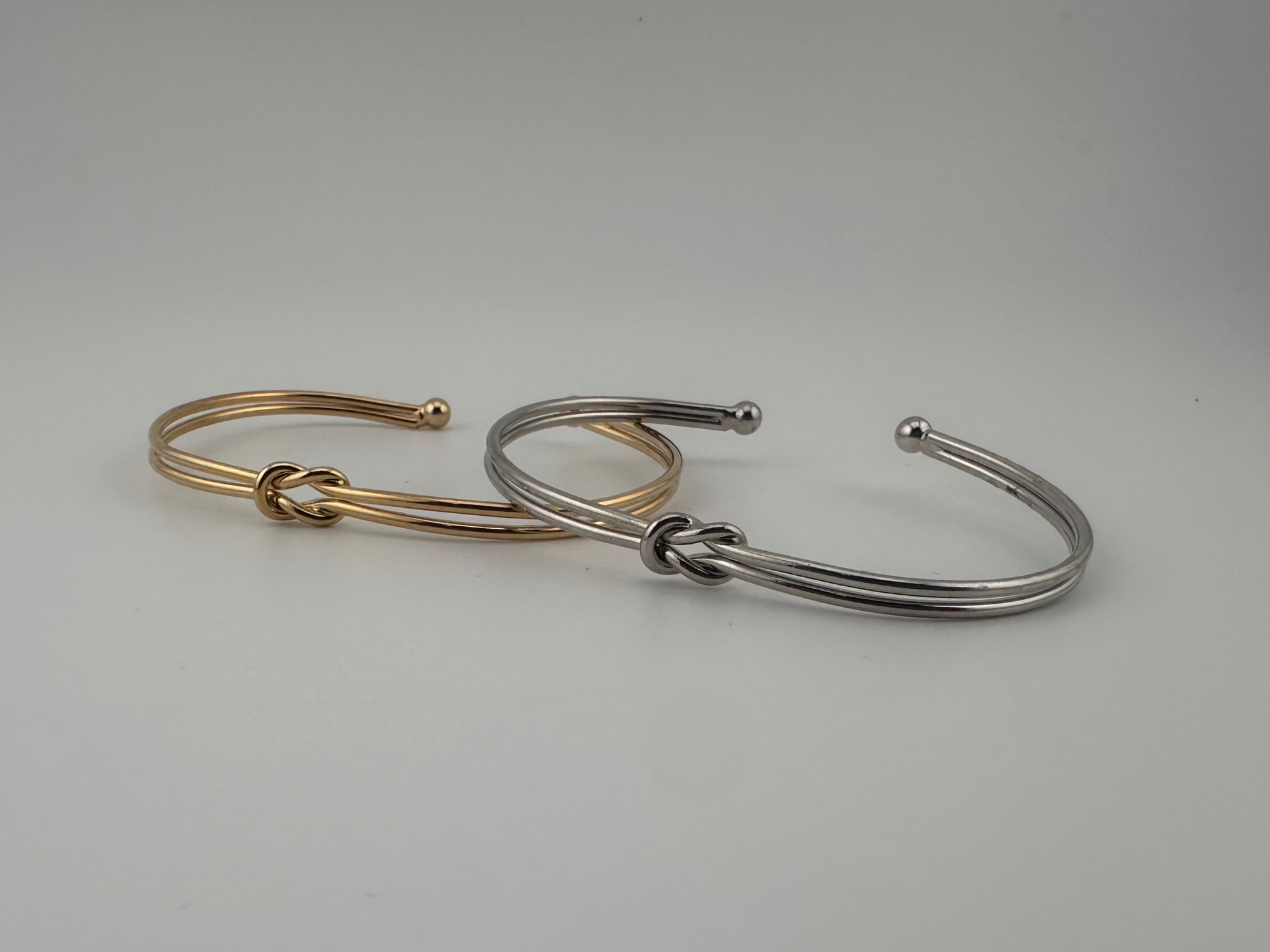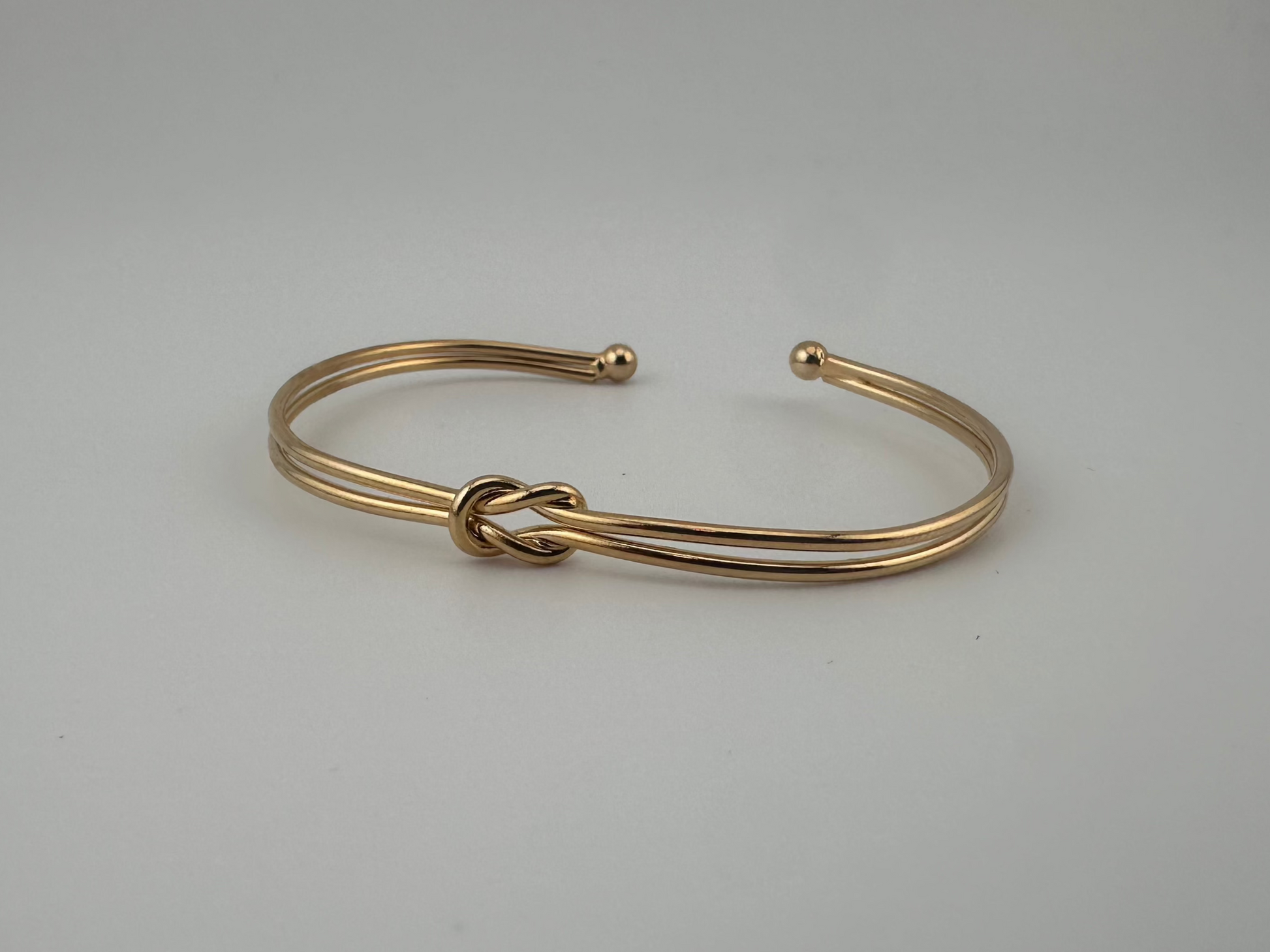 Elegant and symbolic, the Golden Bond Bangle features a sleek 18k gold-filled finish with a graceful knot detail at its center — representing connection, strength, and unity. With its minimal yet meaningful design, this bangle adds a timeless touch of elegance to any look, making it a perfect piece for everyday wear or gifting.