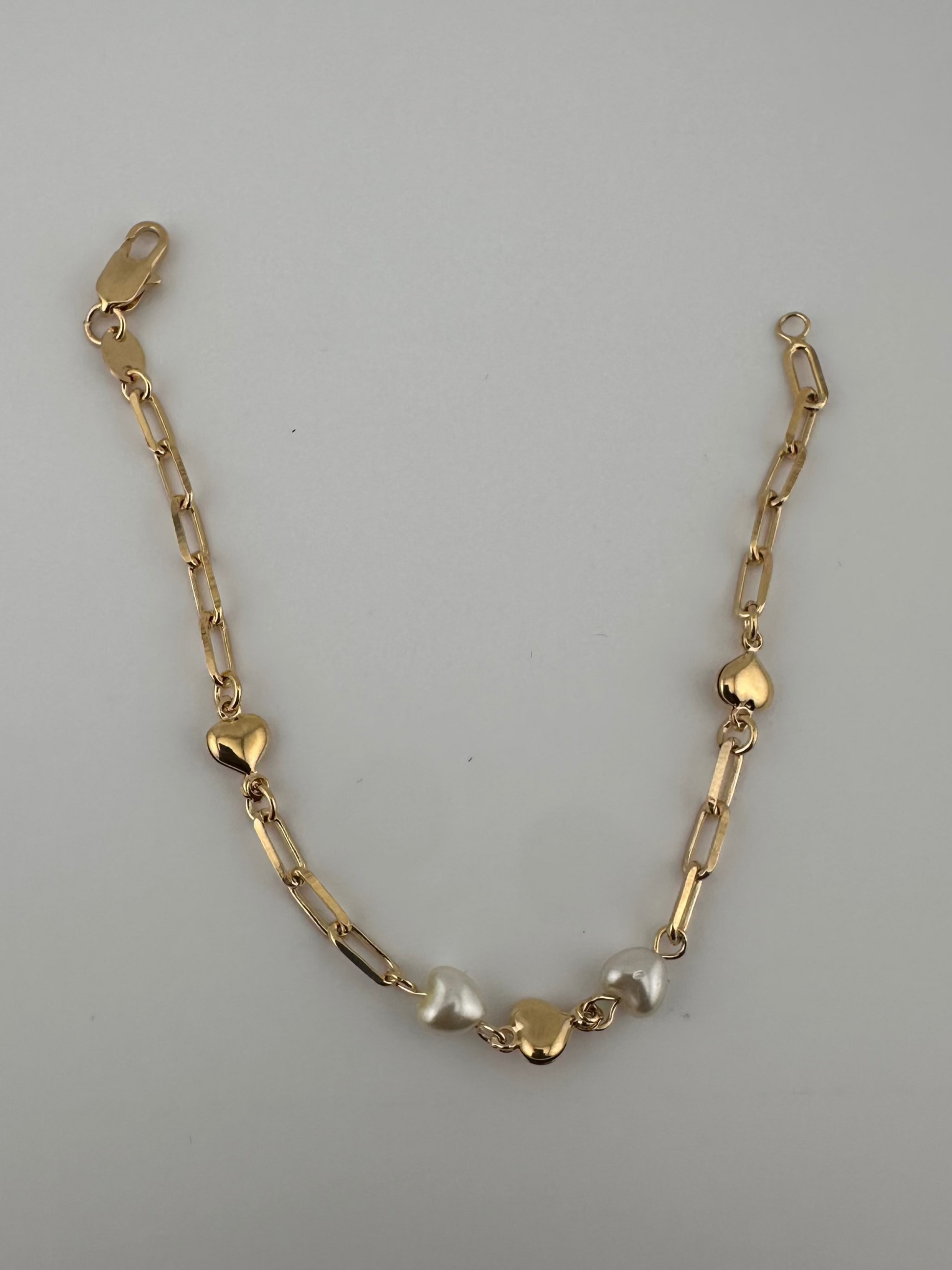Chic and full of charm, the Golden Heartlink Bracelet features a modern paperclip chain in luminous 18k gold-filled metal, accented with delicate heart-shaped pearls. Blending bold structure with soft, romantic detail, this bracelet is a perfect expression of love and style — elegant enough for special moments, yet versatile for everyday wear.