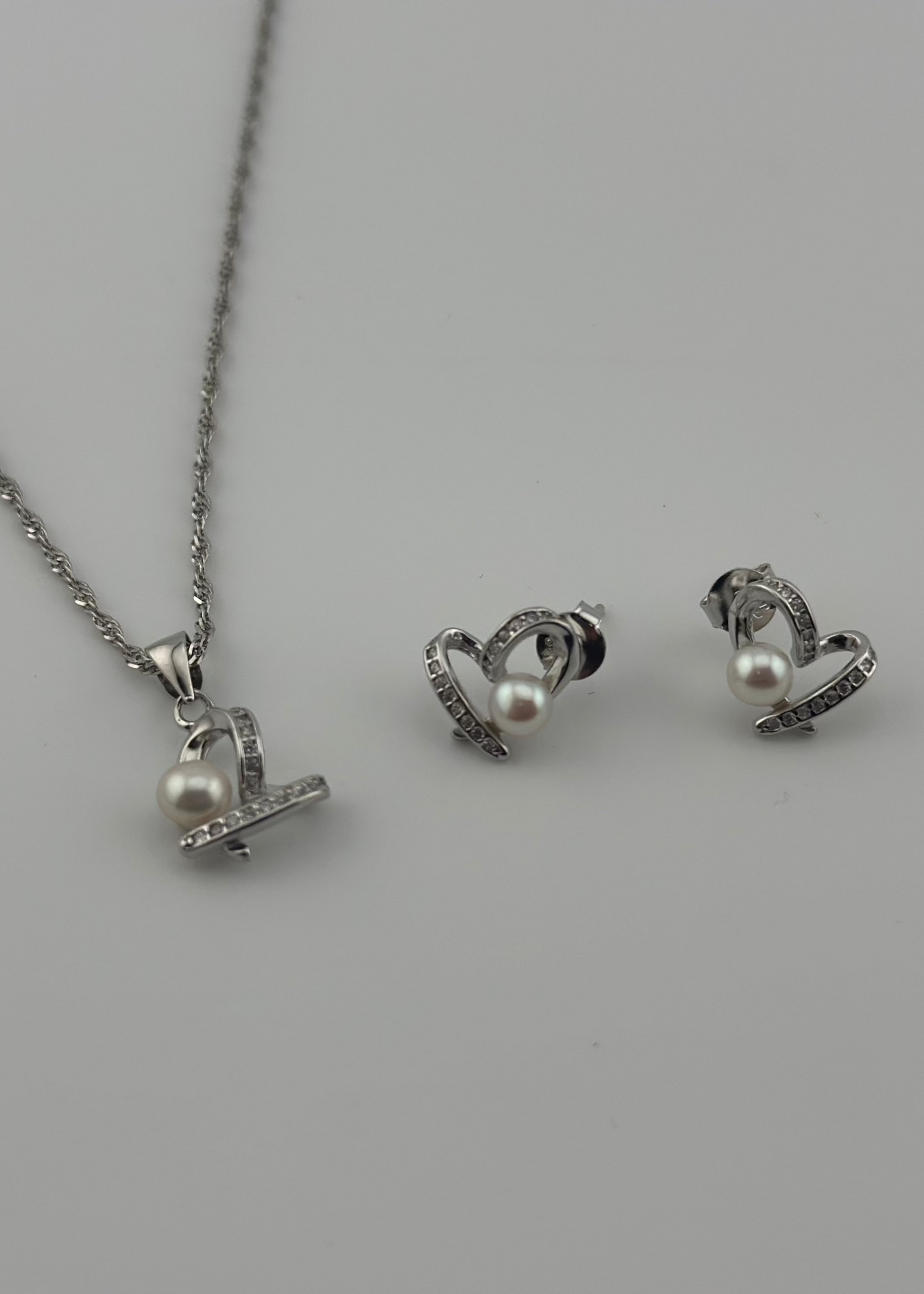 Graceful and full of charm, the Pearl Embrace set features a matching heart-shaped necklace and earrings, each adorned with a luminous pearl nestled at the center. The soft glow of the pearl pairs beautifully with the romantic heart design, creating a look that’s both timeless and elegant. Perfect for special moments or everyday sophistication, this set is a radiant symbol of love and purity.