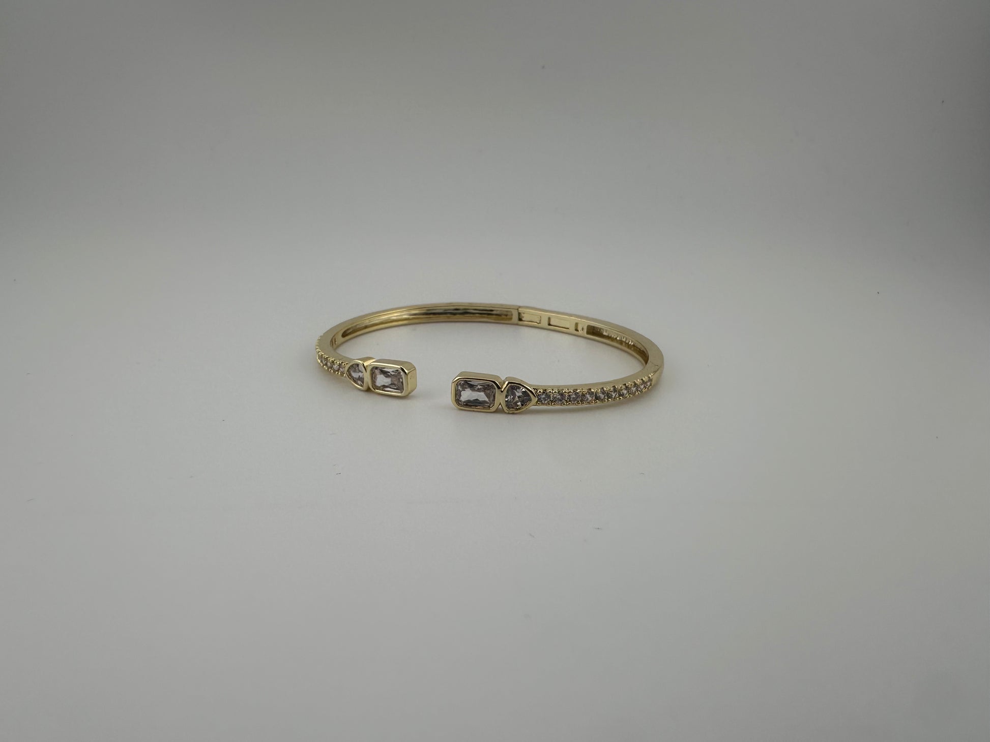 Elegant and luminous, the Radiant Halo Bangle is crafted from 18k gold-filled metal and adorned with a sleek line of sparkling cubic zirconia. Its refined design and brilliant shimmer make it a timeless accessory — perfect for elevating everyday outfits or adding a touch of glamour to special occasions.