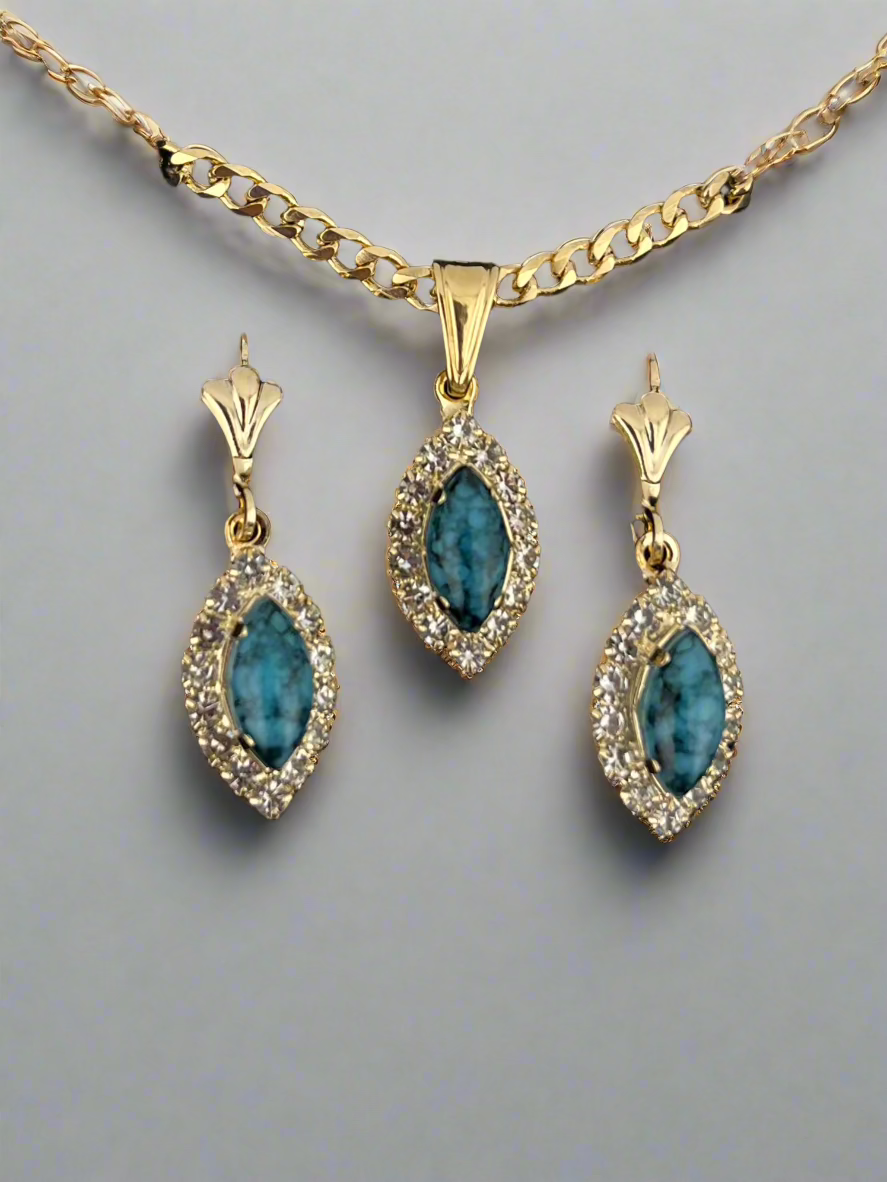 Capture the serene beauty of the ocean with the Sea Breeze Set, featuring radiant Brazilian aquamarine blue stones delicately set in 18k gold-filled metal. This elegant necklace and matching earrings evoke the calm and clarity of crystal-clear waters, making them perfect for adding a refreshing, sophisticated touch to any look. Hypoallergenic and nickel-free, this set is designed for everyday elegance and special occasions alike.