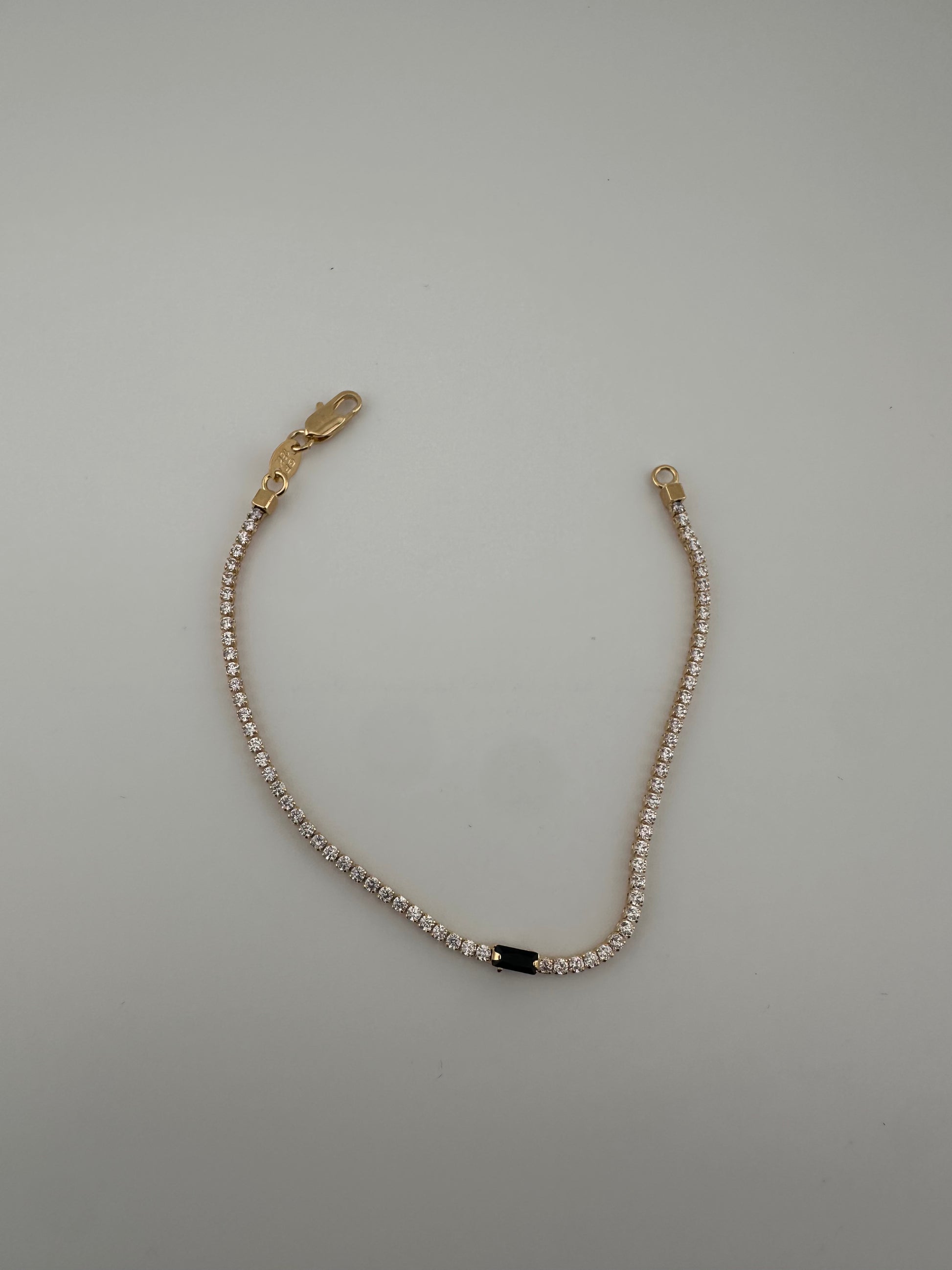 Sophisticated and understated, the Onyx Glow Bracelet features a single striking black stone framed by sparkling cubic zirconia, all set in radiant 18k gold-filled metal. This delicate piece effortlessly balances bold contrast with subtle shimmer, perfect for adding a touch of elegance to any look.