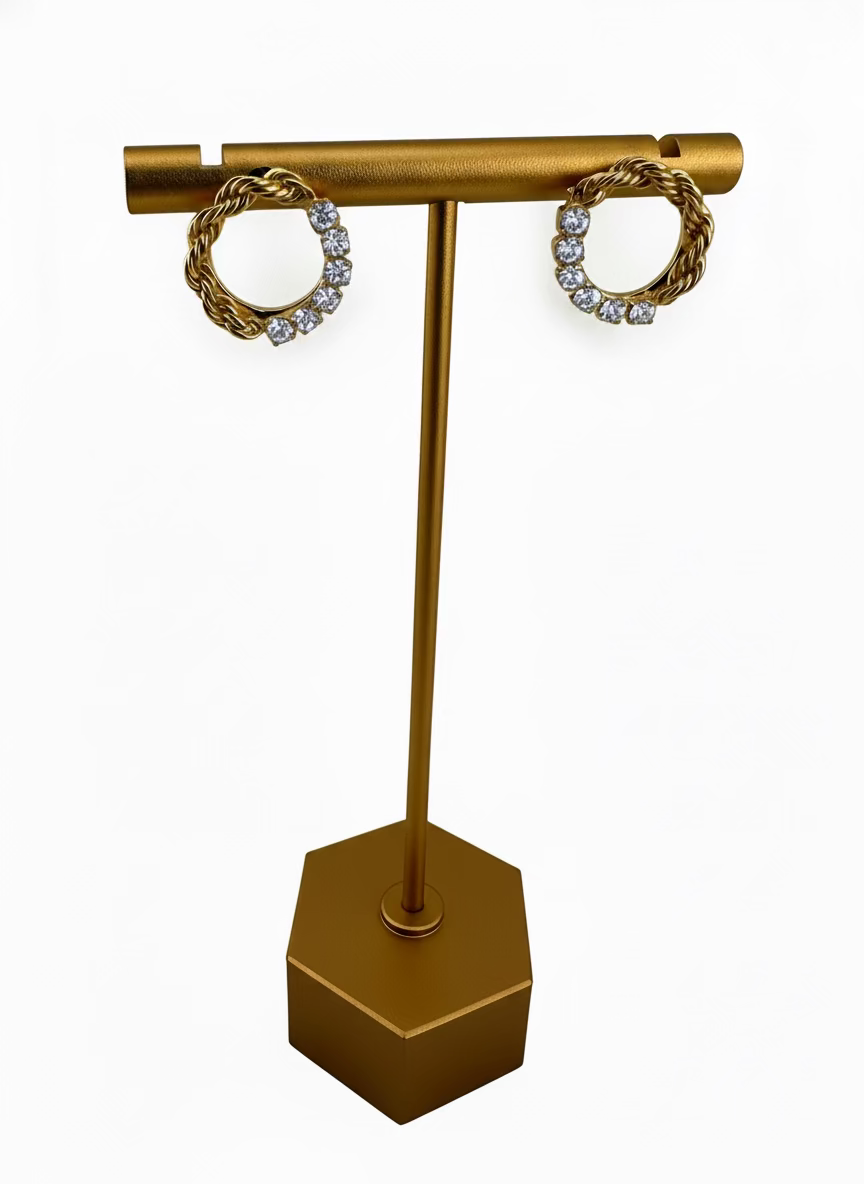 Add a touch of effortless luxury with these 18K gold-filled circle stud earrings. Designed with a twisted rope texture on one side and a row of brilliant CZ stones on the other, they create the perfect balance of shine and elegance. Lightweight, modern, and versatile—ideal for everyday wear or dressing up any look. Hypoallergenic and tarnish-resistant for long-lasting sparkle.
